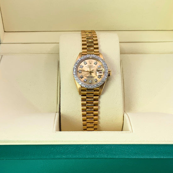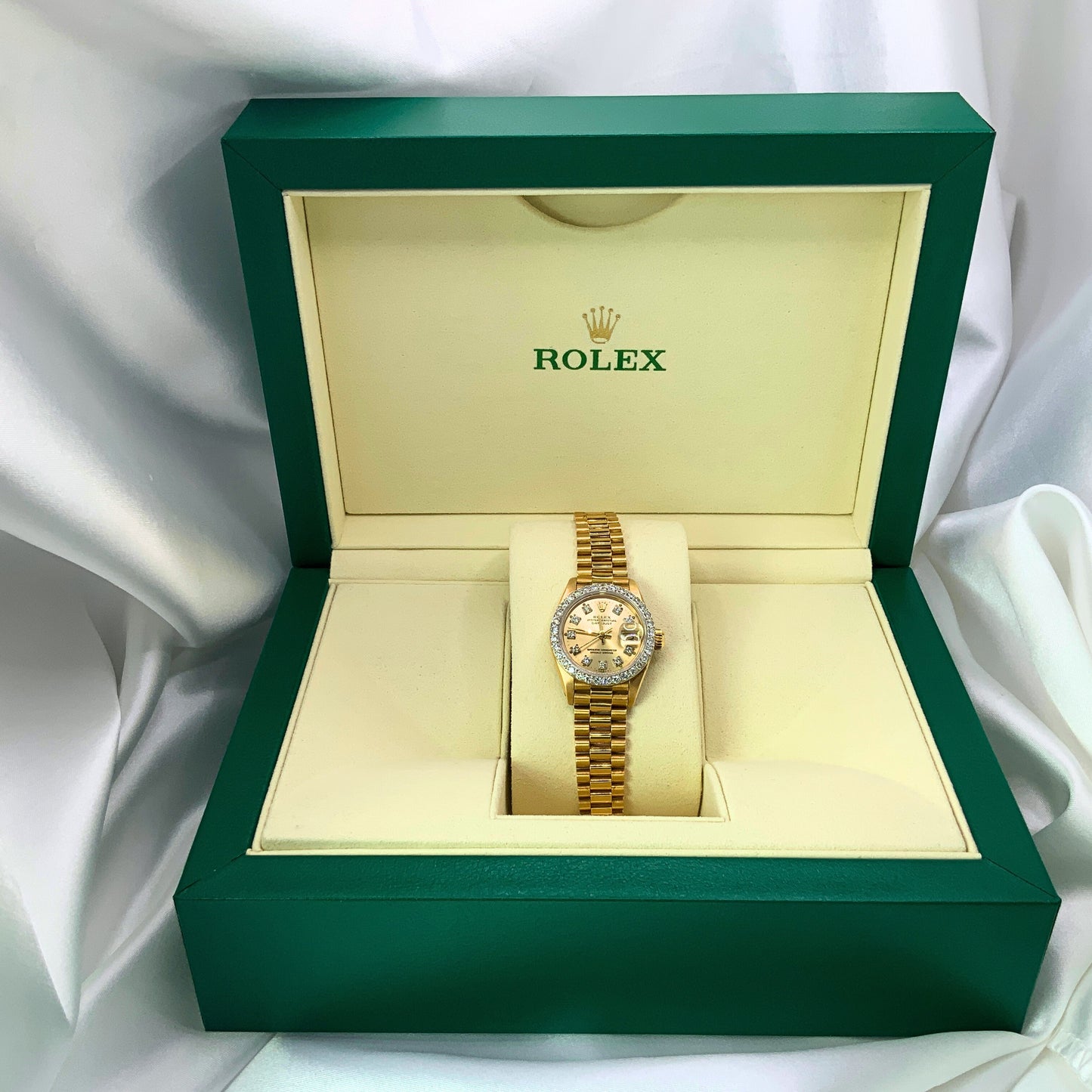 The Oyster Perpetual Lady-Datejust in 18K yellow gold featuring a champagne color, diamond-set dial and a President bracelet.